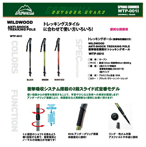 アンチショックトレッキングポール グリーン WILD WOOD / ジェイクリエイト アウトドア 衝撃吸収機能付 アンダーグリップ搭載 2段スライド伸縮式 奈良県 田原本町
