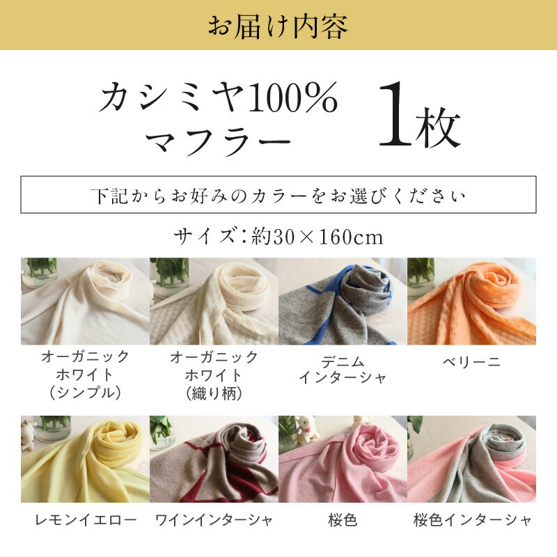 - 【ふるさと納税】『Noble Fibre』100%カシミヤ・マフラー 1枚 選べる カラー 8色 カシミヤ糸 無地 オーガニックホワイト ベリーニ レモンイエロー 桜色 デニム ワイン インターシャ ファッション おしゃれ 肩掛け 衣類 季節の変わり目 お取り寄せ 大阪府 泉佐野市 送料無料