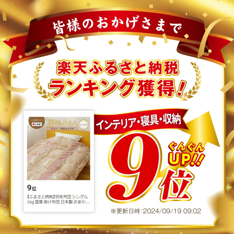 - 【ふるさと納税】【訳あり】 羽毛布団 シングル 1kg 約150 × 210cm 国産 掛け布団 日本製 柄おまかせ 出来たてをお届け 羽毛 ふとん ダウン フェザー 寝具 オールシーズン 日用品 お取り寄せ 大阪府 泉佐野市 送料無料
