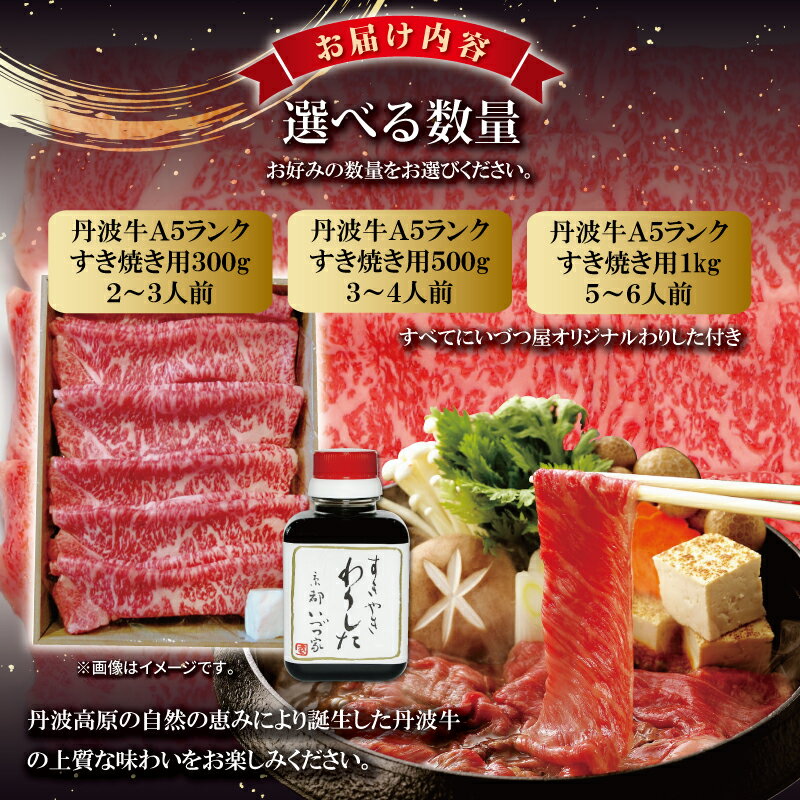 【ふるさと納税】【2026年1月中旬以降発送】 丹波牛 A5ランク すき焼き用 選べる 数量 300g 500g 1kg 黒毛和牛 和牛 すきやき 鍋 国産 京都 丹波 京丹波 しもふり スライス わりした付き いづつ屋