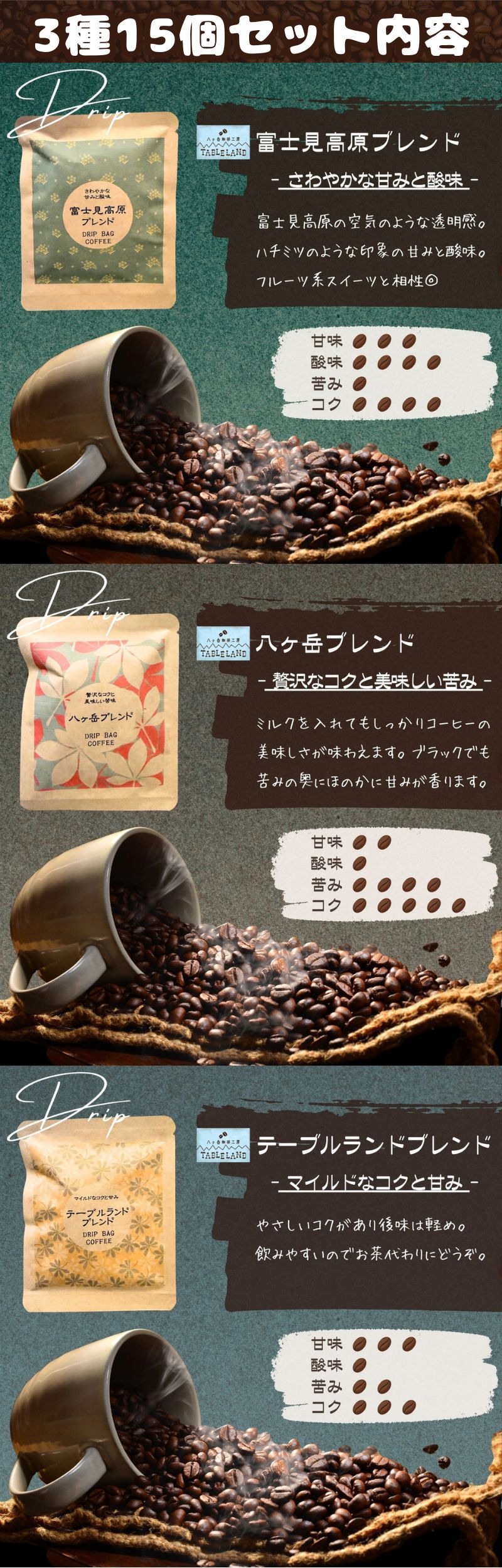 【ふるさと納税】八ヶ岳からお届け ドリップバッグコーヒー 選べる数量 15個~100個入り 3種~15種 飲み比べ ドリップバッグ ドリップパック ドリップ 焙煎 カフェインレス 珈琲 ブレンド コーヒー セット 贈答 ギフト 八ヶ岳珈琲工房テーブルランド 信州 長野県 富士見町