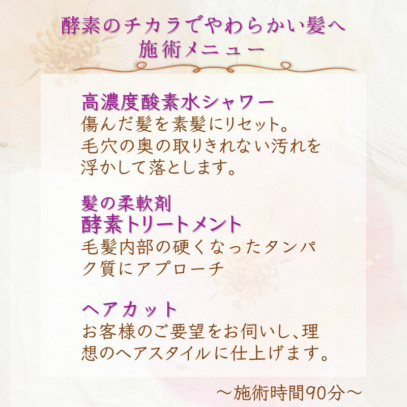 - 【ふるさと納税】髪質改善ケア 施術利用券 酵素トリートメント&ヘアカット&高濃度酸素水ケア 硬い髪 ダメージヘア 「酵素のチカラでやわらかい髪へ 」 90分コース