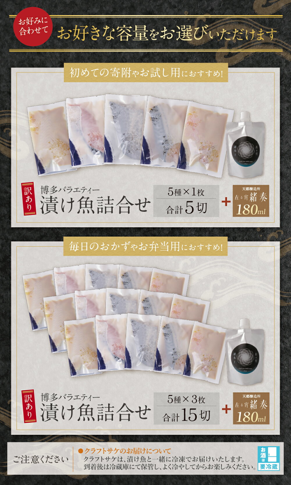 - 【ふるさと納税】 訳あり 博多バラエティー漬け魚詰合せセット(5切/15切)&クラフトサケ「緒奏」(180ml)セット 博多若杉 大容量 お試し 西京漬け 魚 和食 家庭用 個包装 小分け 切り身 酒 お酒 天郷醸造所 ギフト コラボ 福岡 ★レビューキャンペーン開催中★