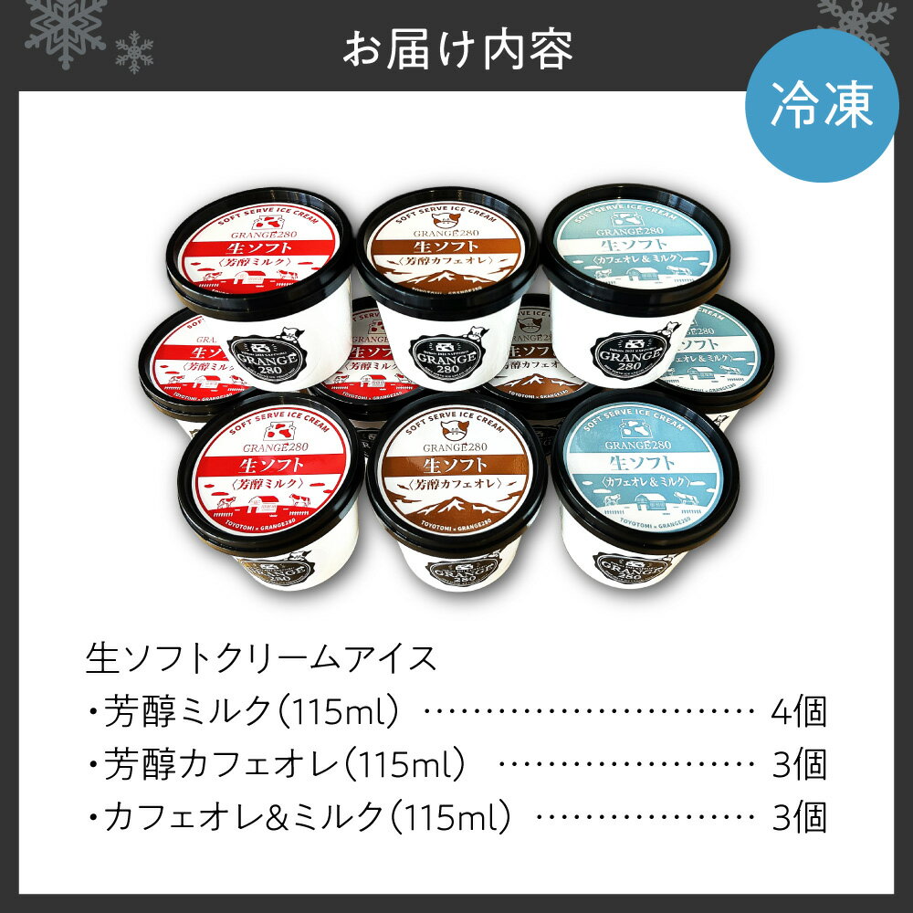 - 【ふるさと納税】 北海道産 牛乳使用★ 3種 生ソフトクリーム アイス 計10個 各115ml セット 芳醇 ミルク カフェオレ カフェオレ&ミルク 食べ比べ とよとみ牛乳 カップアイス アイスクリーム ソフトクリーム お取り寄せ スイーツ デザート 冷凍 北海道 札幌市