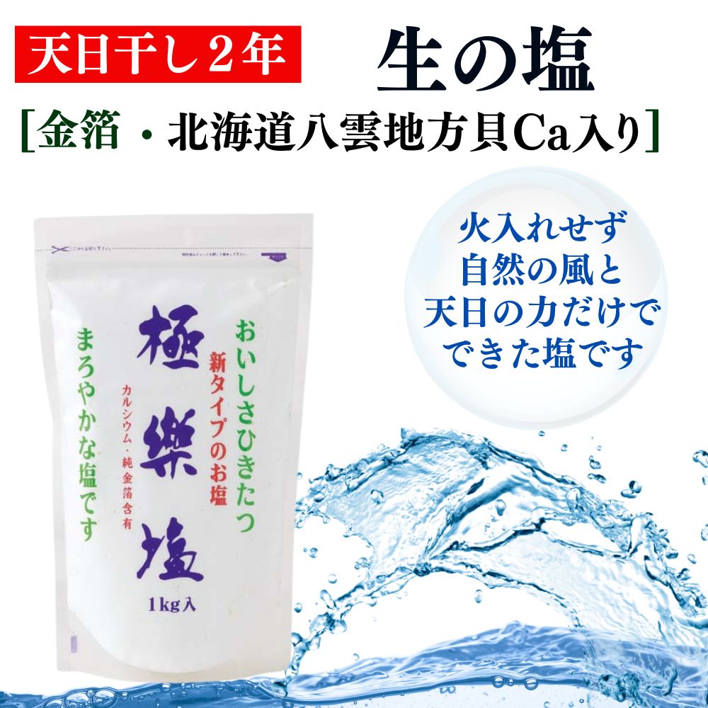 【ふるさと納税】天日干し2年! 火入れしない生の塩 極楽塩 1kg 金箔 北海道産八雲産ニシキ貝の貝殻化石カルシウム入り こだわりの製法 塩 食塩 海塩 調味料 ソルト お清め 美容 入浴 うがい 歯磨き