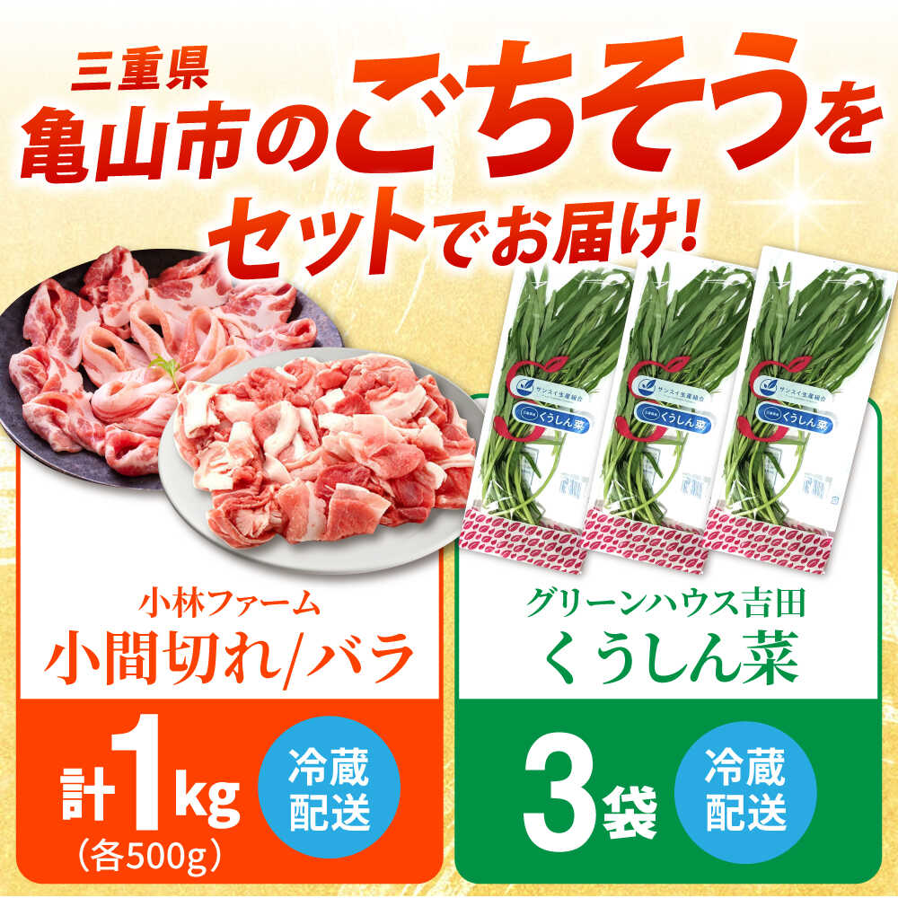 【ふるさと納税】ええやんさくらポーク バラ 小間切れ 各500g 朝採れ くうしん菜 3袋セット / 亀山市 / 小林ファーム[AMAB075]