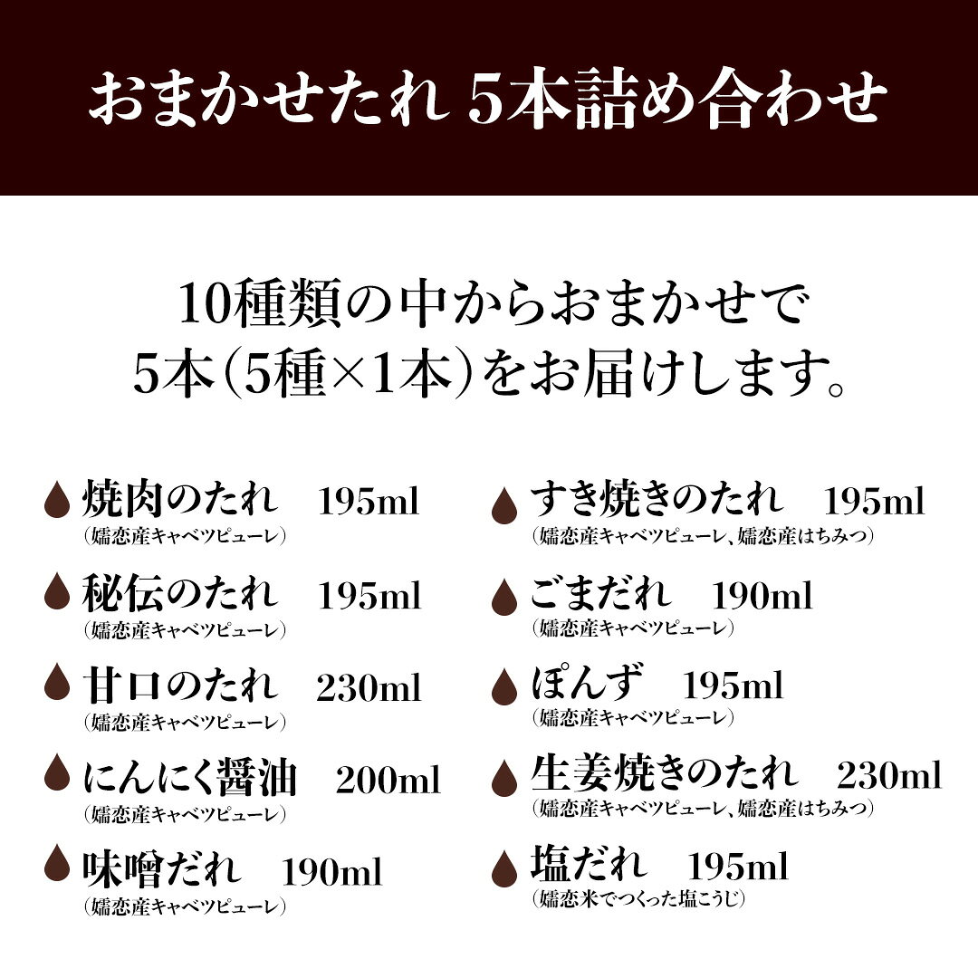 - 【ふるさと納税】 【 年内お届け 12/8入金確認分まで】 【訳あり】 肉料理のタレ おまかせ 5本 詰め合わせ 調味料 国産 加工品 万能調味料 人気 焼き肉 タレ おすすめ 特製たれ 食べ比べ バーベキュー キャンプ おすそ分け
