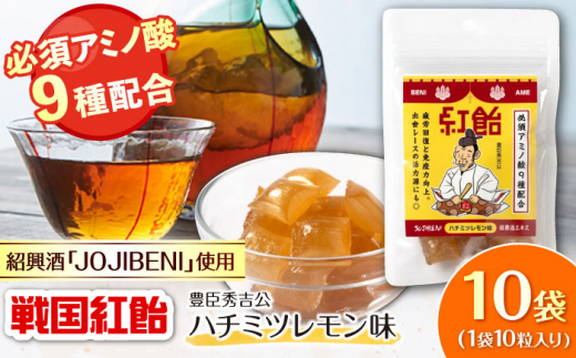 【JOJIBENI】 飴 アミノ酸たっぷりの紹興酒を使った 戦国紅飴 豊臣秀吉ハチミツレモン味 個包装 10袋入り(計100粒)【クインズゲイトオリジナル】 お菓子 アメ アミノ酸 個包装 戦国武将 おすすめ 人気 100個 大容量 詰め合わせ あめ キャンディ スイーツ デザート おやつ JOJIBENI はちみつ 蜂蜜 レモン 敬老の日 岐阜市/クインズゲイト [ANBI010]