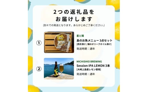 島のお魚メニュー 3点セット / 大崎上島のクラフトビール Session IPA Lemon 3本 西京漬け 鯛のオリーブオイル漬け 星と陽のひとしほ レモン 檸檬 瀬戸内レモン クラフトビール 地ビール 爽快 ホップ 晩酌 国産 瀬戸内 広島 離島 セット