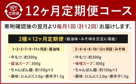 - 【12カ月定期便】 人気の博多もつ鍋 3人前 醤油味・味噌味を交互にお届け! もつ鍋 モツ鍋 もつ モツ 牛もつ 鍋 醤油 味噌 冷凍 福岡県 北九州市
