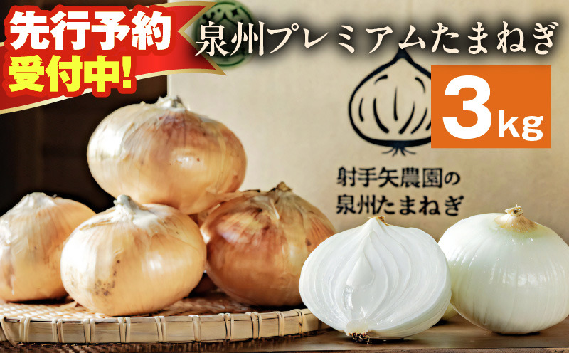 - G3679 【先行予約】射手矢さんちの泉州プレミアムたまねぎ 3kg 【玉ねぎ タマネギ 玉葱 甘い 野菜 国産 期間限定 オニオン スライス サラダ カレー シチュー バーベキュー BBQ 肉じゃが】