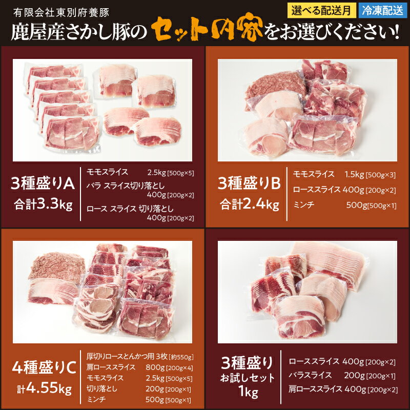【ふるさと納税】<配送時期が選べる>鹿屋産 さかし豚 選べる 3種 4種盛り 肉 豚肉 モモ バラ ロース スライス ミンチ ひき肉 しゃぶしゃぶ 豚しゃぶ とんかつ 小分け 真空パック 国産 鹿児島県産 冷凍 東別府養豚 鹿児島 鹿屋市 おすすめ ランキング プレゼント ギフト