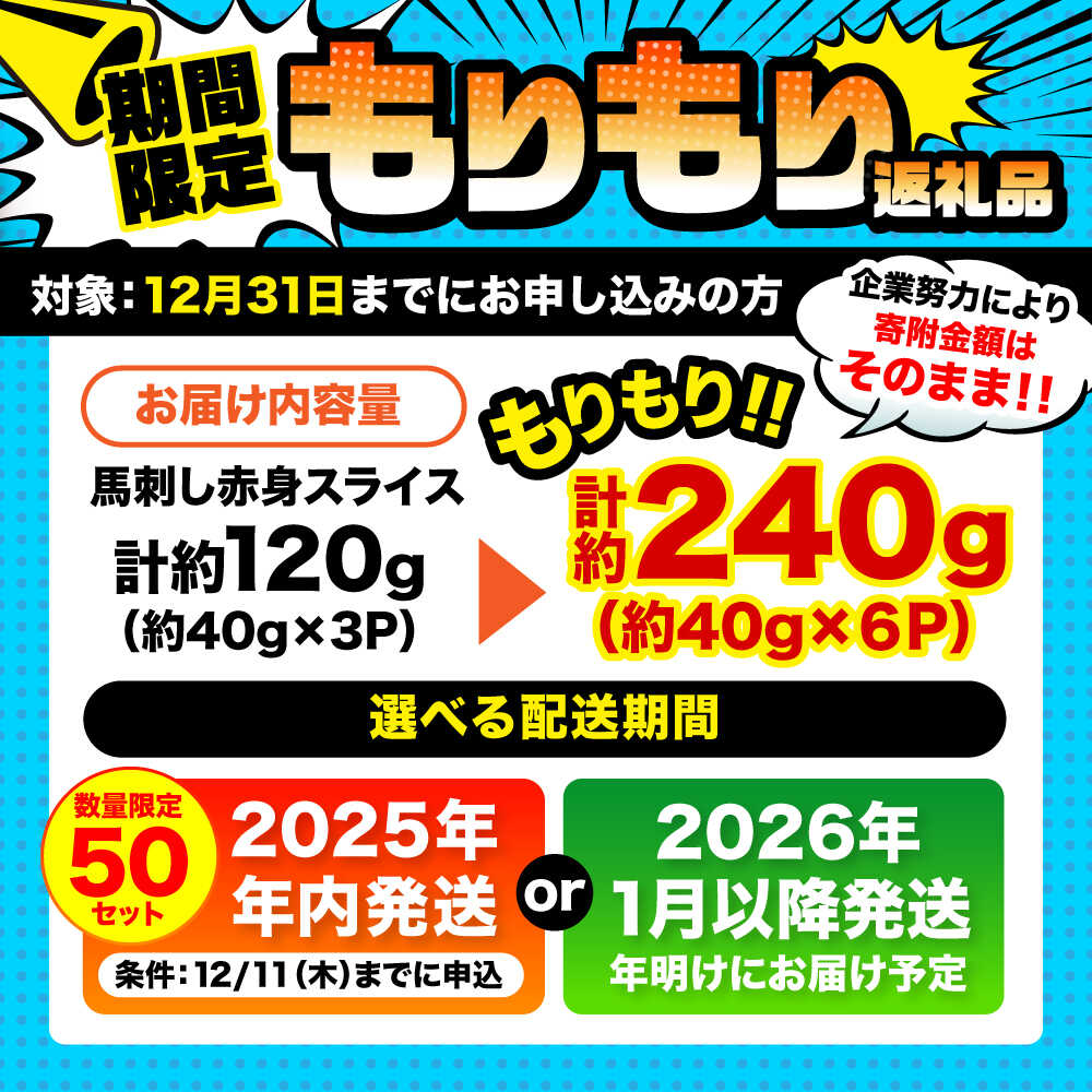 - 【ふるさと納税】【選べる発送時期 年内発送 or 1月以降発送 】【もりもり返礼品】まな板不要 ! フジチク 切れてる馬刺し ( 約40g × 6パック ) 計約240g スライス済み 国産 馬刺し 生姜付き 小分け 馬刺 馬肉 赤身 国産 赤身馬刺し 冷凍【株式会社フジチク】[BHAD006]