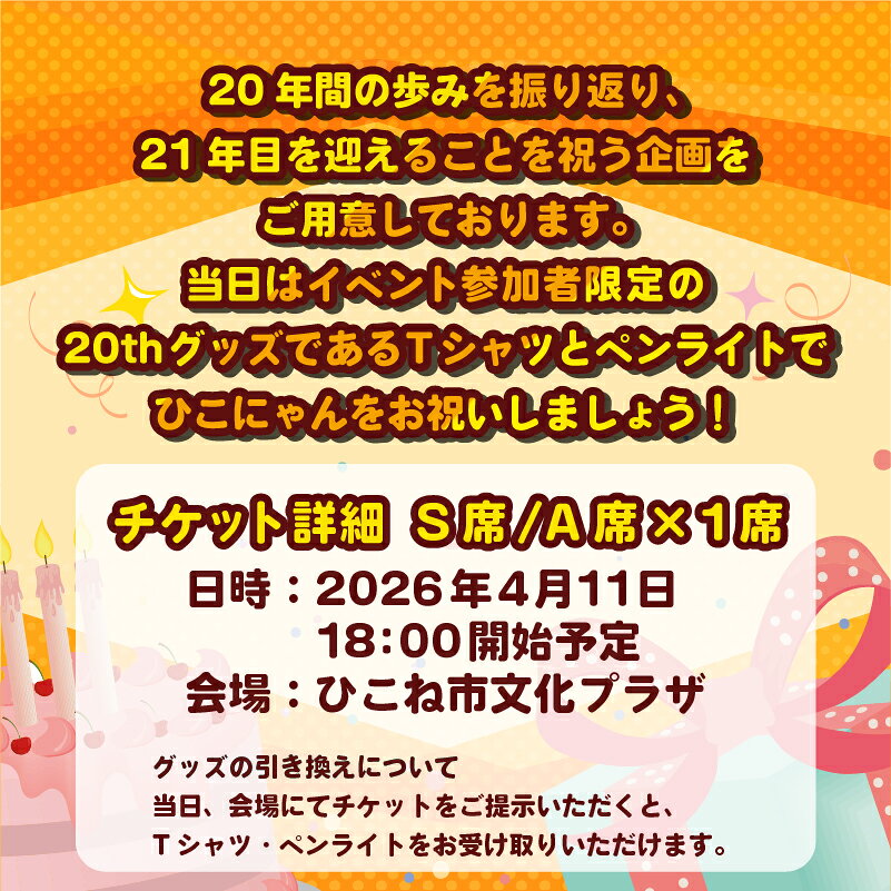 - 【ふるさと納税】 ひこにゃん 生誕20周年記念パーティー \席種とTシャツサイズが選べる/ S席 A席 Lサイズ XLサイズ 20周年 周年 イベント パーティー ご当地キャラクター ご当地 ご当地キャラ チケット キャラ キャラクター 滋賀 彦根