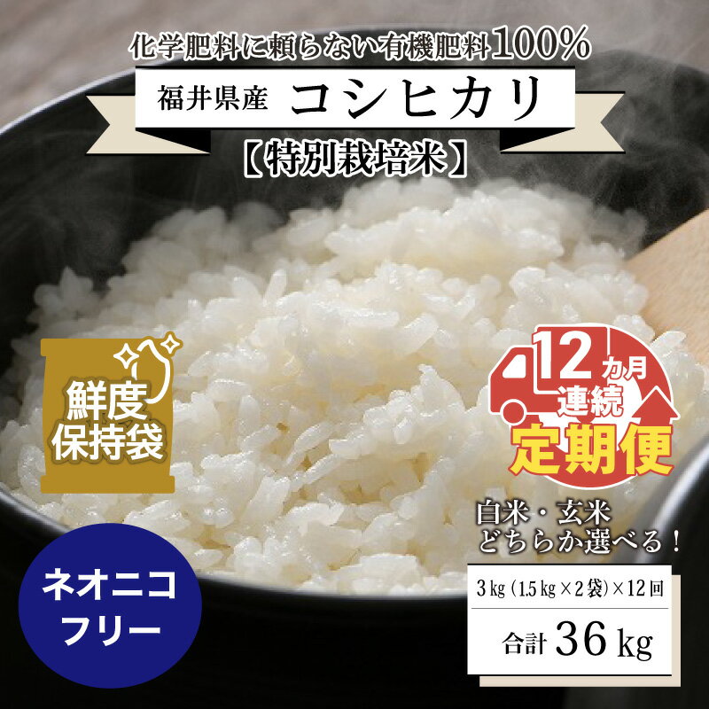 - 【ふるさと納税】【先行予約】【令和8年産・新米】【12ヶ月連続お届け】【特別栽培米】福井県産 コシヒカリ 1.5kg × 2袋 計3kg 〜化学肥料にたよらない100%の有機肥料〜 ネオニコフリー スタンドパック 【保存に便利】【2026年10月以降順次発送予定】