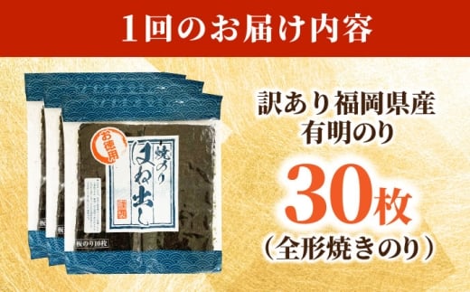 【全6回定期便】【訳あり】 福岡県産有明のり キズ海苔 全型30枚 吉富町/株式会社ゼロプラス [BGAA047] 海苔 訳あり わけあり 焼海苔 焼き海苔 のり ノリ 全形 有明海苔 手巻き海苔 手巻きのり 国産 わけあり 福岡県 全型