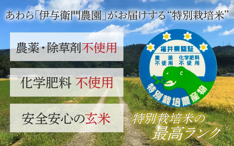 【先行予約】【令和8年産 新米】《定期便6回》伊与衛門農園のコシヒカリ 玄米 5kg (計30kg)特別栽培米 化学肥料不使用 <温度と湿度を常時管理し新鮮米を出荷!>/ 高品質 鮮度抜群 福井県あわら産 ブランド米 お米 ※ 2026年10月上旬以降順次発送 [aw071-i004]