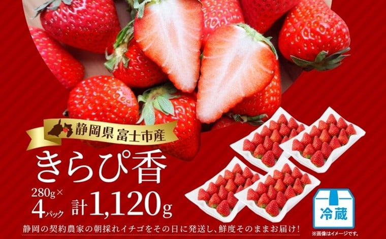 期間限定 富士市産 いちご きらぴ香 約280g×4p 朝どれ 新鮮いちご 糖度が高い 甘み 上品な香り 凝縮 爽やか 酸味控えめ みずみずしい なめらか 果物 フルーツ 旬 ギフト 贈り物 【配送不可地域:沖縄・離島】[sf123-004]