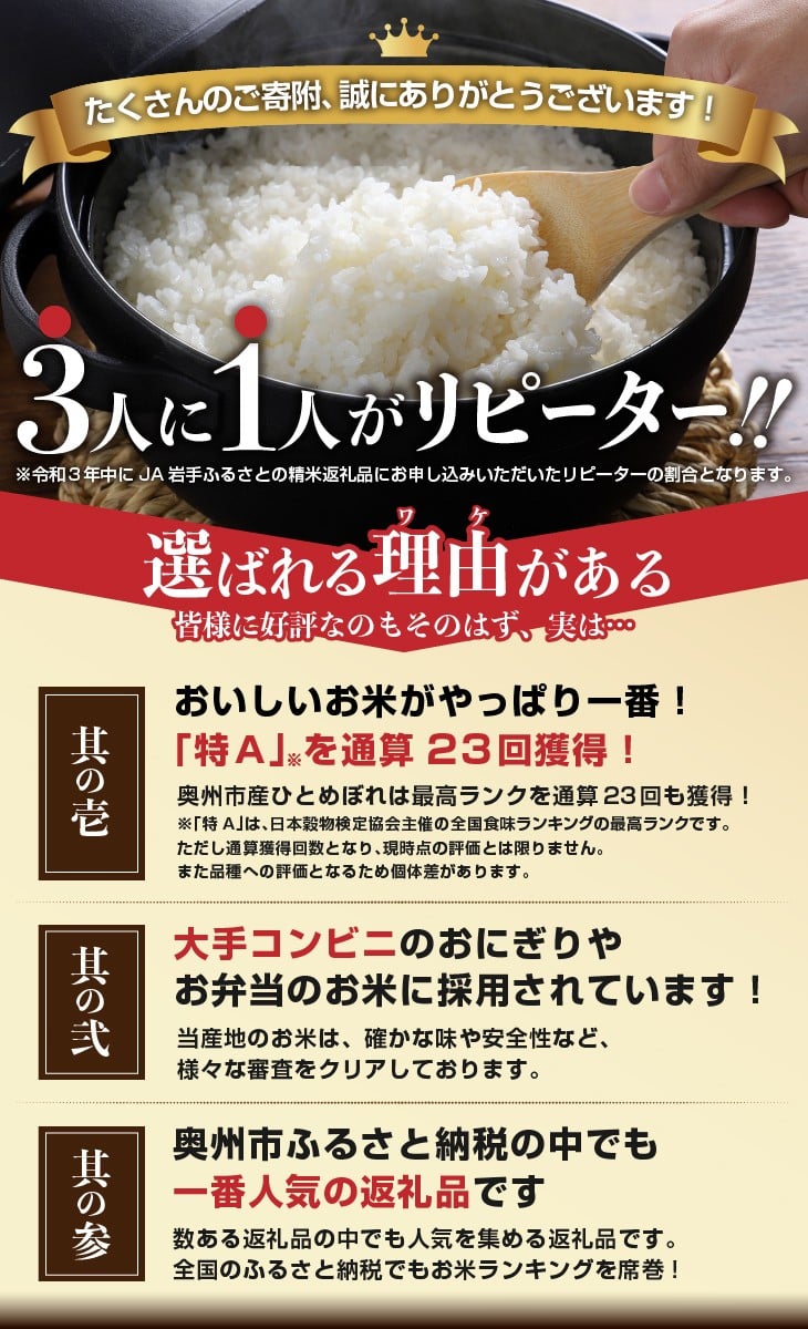 3人に1人がリピーター!☆全3回定期便☆ 岩手ふるさと米 10kg×3ヶ月 令和7年産 一等米ひとめぼれ 東北有数のお米の産地 岩手県奥州市産【配送時期に関する変更不可】 [U0150]