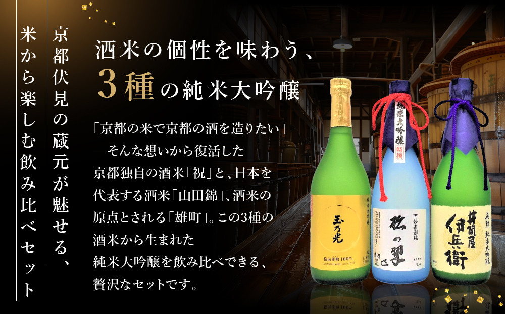 【吟醸酒房 油長】京都伏見の酒 祝/山田錦/雄町 3本飲み比べ|日本酒 純米大吟醸 人気セット[ 京都 伏見 日本酒 純米大吟醸 720ml 3本飲み比べ 英勲 神聖 玉乃光 人気 おすすめ お酒 地酒 ご当地 酒蔵 酒造 ギフト プレゼント 贈答 お取り寄せ 通販 送料無料 ふるさと納税 ] 261009_A-CN004