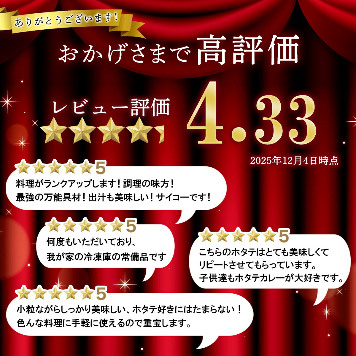 - 【ふるさと納税】 【選べる内容量】 高評価 ★4.3 獲得 訳あり ホタテ 北海道産 不揃い ボイル ベビーホタテ 1kg~3kg 加熱用 バラ冷凍 シーフード ほたてごはん ほたてマリネ シーフードカレー シーフードミックス シチュー 海鮮 魚介類 送料無料