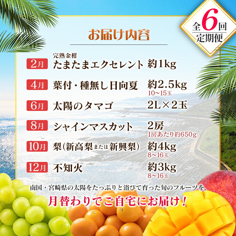 - 【ふるさと納税】【偶数月 6回定期便】旬 人気 フルーツ 南国宮崎産 太陽のタマゴ きんかん シャインマスカット 日向夏 梨 みかん 柑橘 マンゴー ぶどう 果物 詰め合わせ<A-2コース M120>