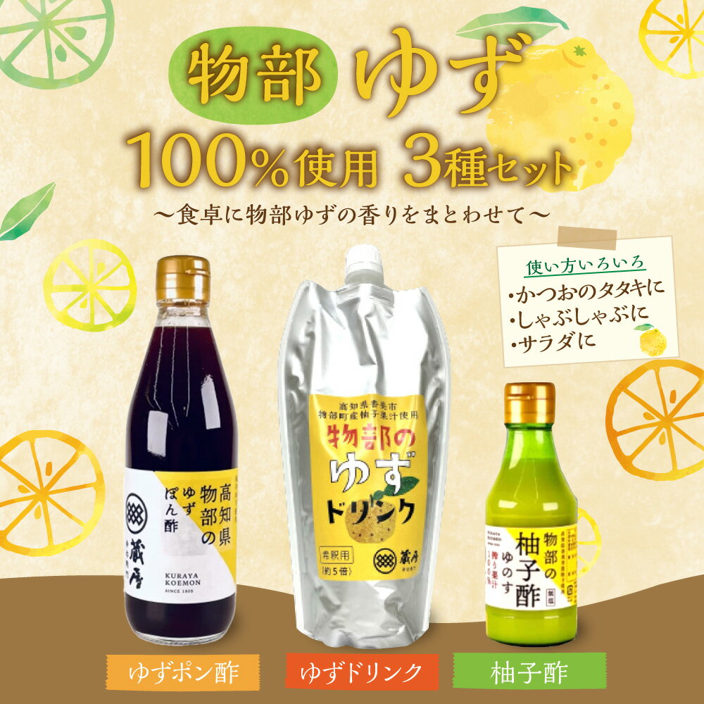 【ふるさと納税】物部ゆずポン酢(360ml×1本)・蔵屋幸右衛門 ゆずドリンク(500ml×1本)・物部の柚子酢(150ml×1本) セット 合計3本 ゆず果汁100% 化学調味料 合成甘味料 保存料不使用 調味料 飲料 高知県産 国産 高知県 香美市 送料無料