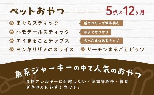 - 【毎月届く】&WAN Kitchenペットおやつセット(海の幸堪能セット)(サメスライス/鮭まるごとビッツ/まぐろスティック/ハモしっぽ/エイまるごとチップ) SMU024