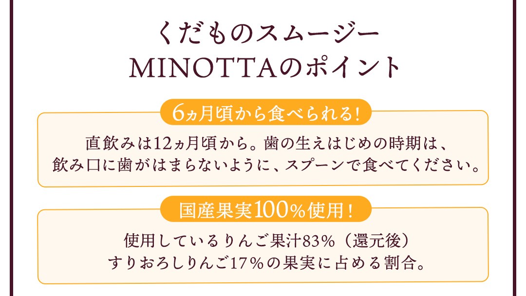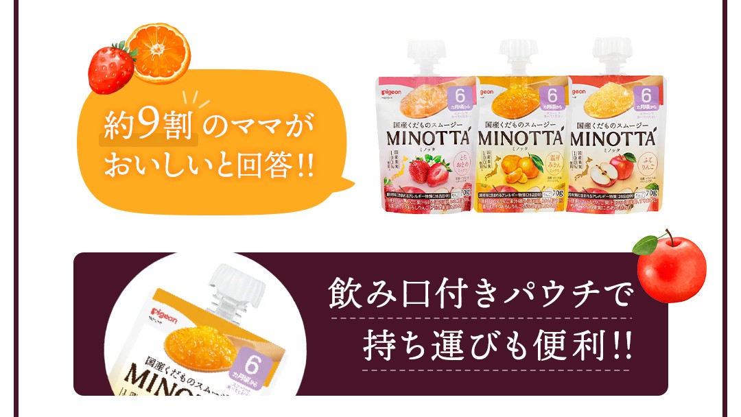- 【ピジョン】国産くだものスムージーMINOTTA(ミノッタ) 温州みかんミックス×24個 6ヵ月頃から 飲料 スムージー 赤ちゃん ベビー 新生児 乳児 離乳食 国産果実 スムージー 朝ごはん おやつ くだもの 果物スムージー 離乳食 みかん 簡単調理 防災 非常食 ローリングストック