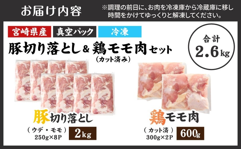 宮崎県産豚切り落とし2kg&鶏モモ肉(カット済み)600g_MJ-N501_(都城市) 宮﨑県産 切り落とし ウデ・モモ 豚肉 小分け 宮崎県産鶏 真空パック もも肉 カット済