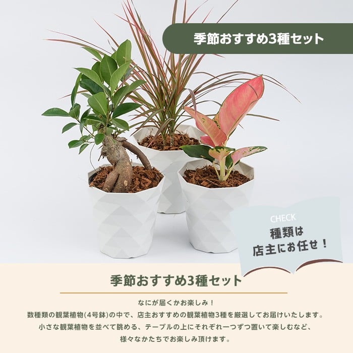 - 2026年3月中旬~発送【観葉植物】店主におまかせ!季節おすすめ3種セット4号鉢×3(Green Base/014-1510) 南国鹿児島県で育った 観葉植物!植物 鉢付 インテリア 室内 オフィス おしゃれ プレゼント ギフト 開店祝い 移転祝い マイナスイオン【配送不可地域:北海道・沖縄県・離島】