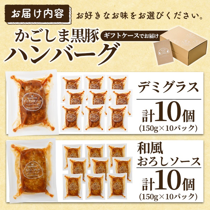 - a563 選べる!かごしま黒豚ハンバーグ10個計1.5kg(デミグラスソースor和風おろしソース)【AKR Food Company】姶良市 ハンバーグ 湯煎 冷凍 鹿児島黒豚 国産 鹿児島県産 肉 豚 豚肉 惣菜 総菜 冷凍ハンバーグ おかず 温めるだけ 簡単 個包装 小分け