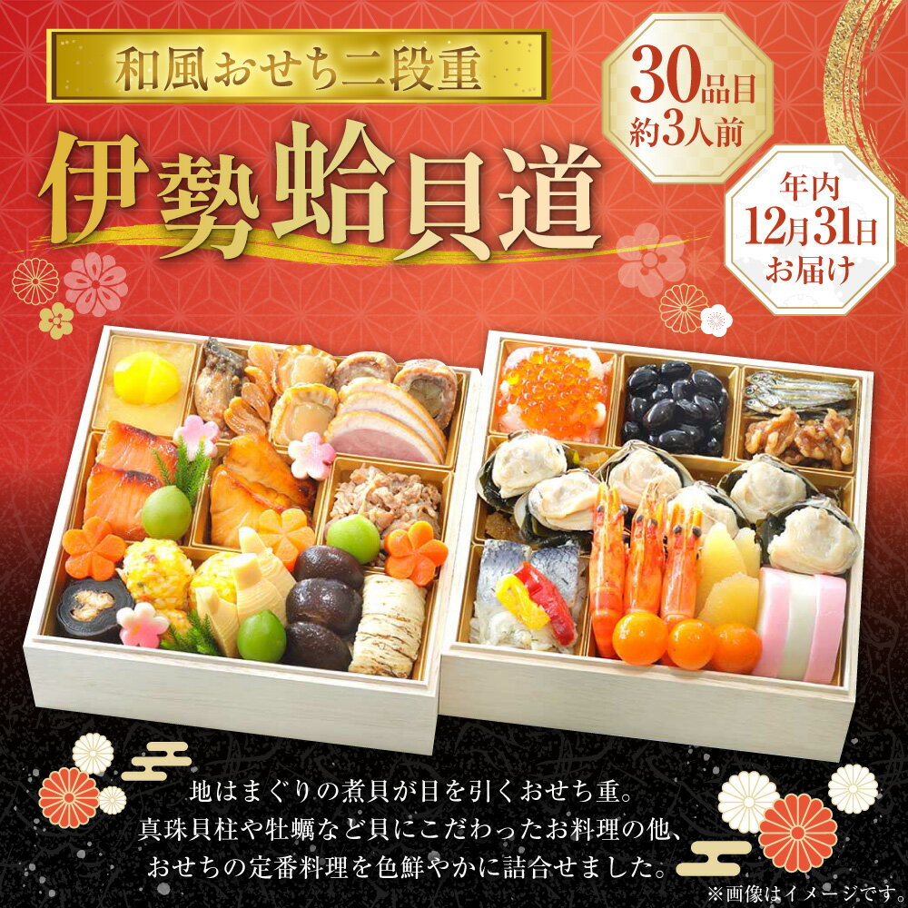 - 【ふるさと納税】 年内発送 和風おせち 二段重 「伊勢蛤貝道」 計30品目 3人用 いくら醤油漬 はまぐり煮 真珠貝柱 牡蠣 黒豆煮 数の子 栗甘露煮 栗きんとん 鰹出汁 牛肉しぐれ煮 お肉 貝 魚介類 水産物 お節 御節 おせち料理 お正月 年末 年末年始 冷蔵 【2025年12月31日着】