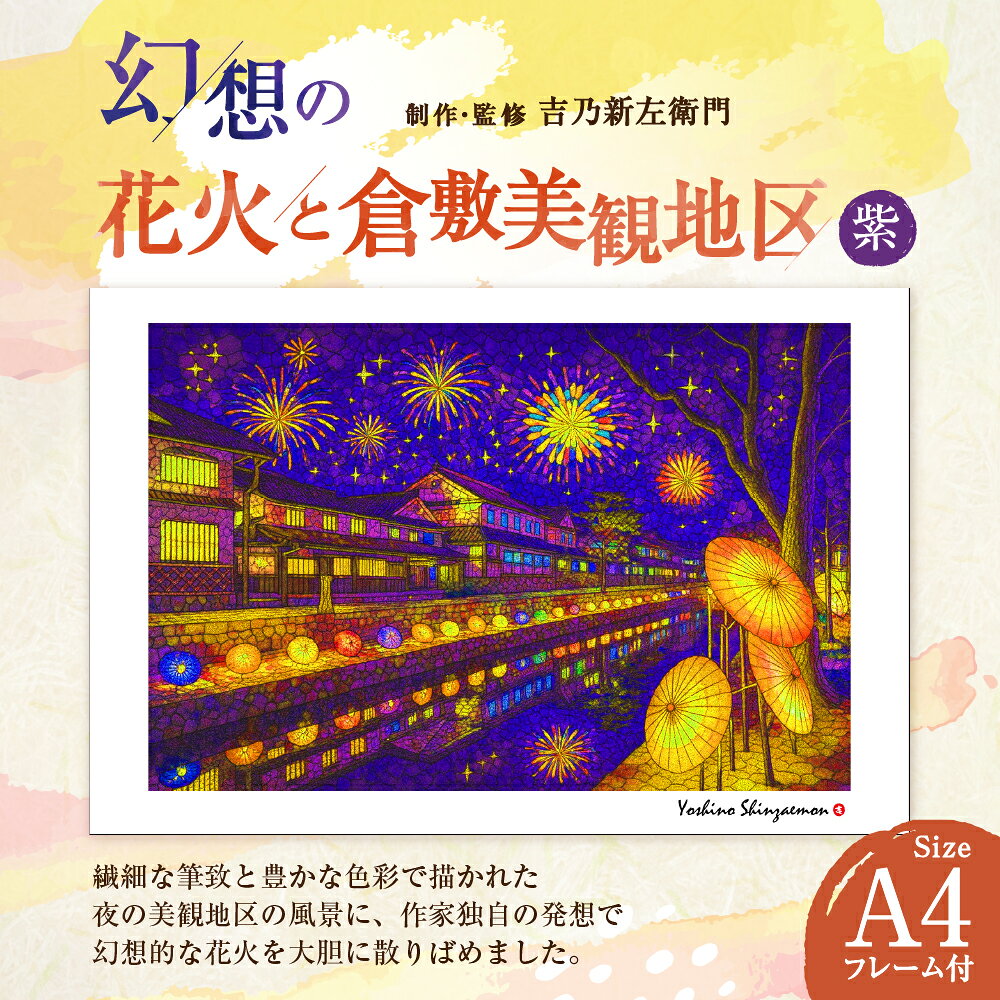 【ふるさと納税】幻想の花火と倉敷美観地区 紫 1枚 A4サイズ版 吉乃新左衛門 現代アート 倉敷の風景 美観地区の景色 atelier SHINZAEMON作画 原画コピー オリジナル額縁付 旅の思い出 ふるさとへの思い 部屋の雰囲気を最適化 絵画 インテリア 美術品 岡山県 倉敷市 送料無料