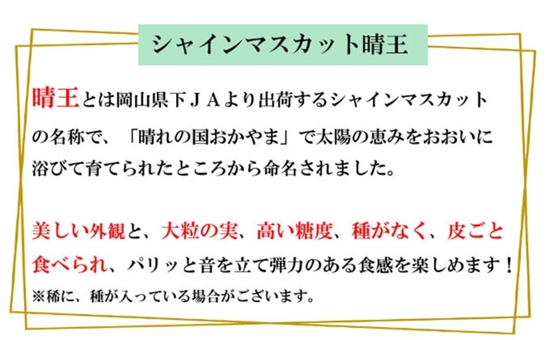 - [№5615-0849]ぶどう 2026年 先行予約 シャイン マスカット 晴王 約500g×2房 種無し ブドウ 葡萄 岡山県産 国産 フルーツ 果物 ギフト