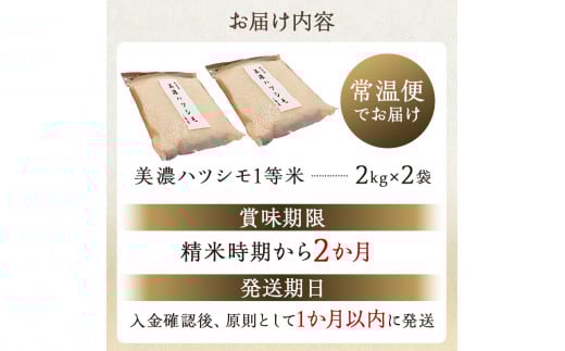 - 2025年産米 美濃ハツシモ 1等米4kg(2kg×2袋)【米 白米 ごはん 自家精米 歯ごたえ あっさり】