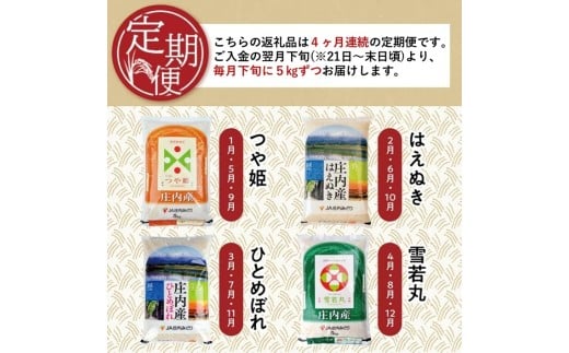 - ≪4ヶ月定期便≫ 庄内米味比べ 5kg×4ヶ月 つや姫 はえぬき ひとめぼれ 雪若丸 計20kg 山形県庄内産 毎月下旬頃にお届け 東北 酒田市 庄内地方 庄内平野 お米 精米 白米 ブランド米 庄内米 ごはん ご飯 農協 JA 産地直送 JA庄内みどり SG0115
