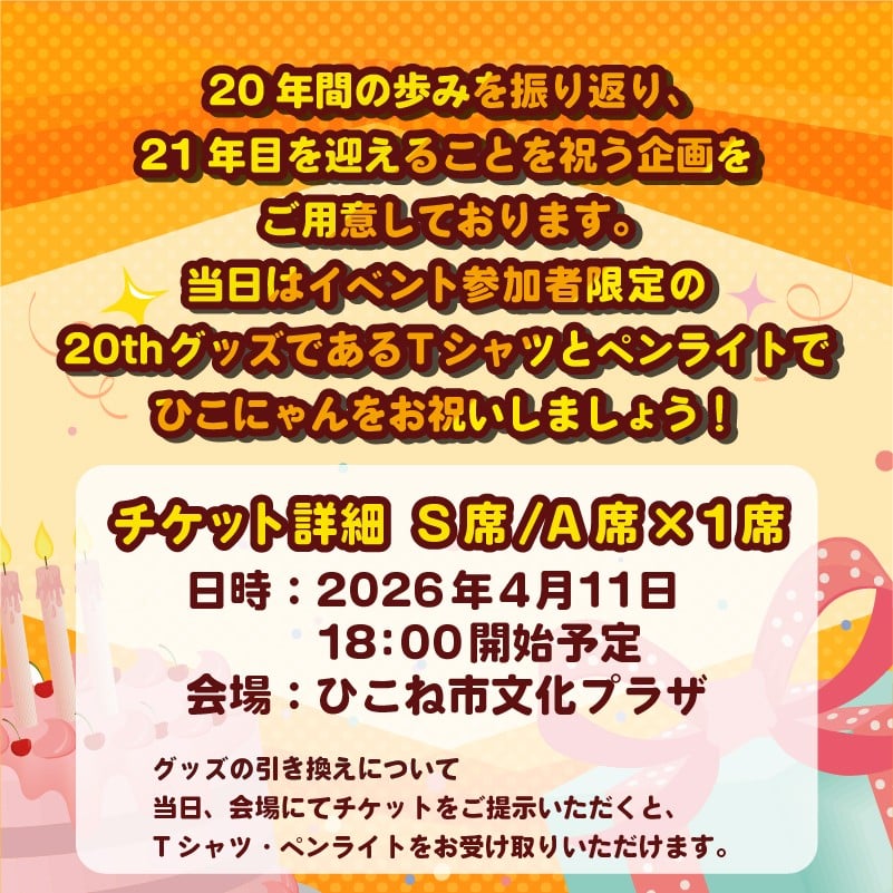 ひこにゃん 生誕20周年記念パーティー 【席種とTシャツサイズが選べる】 S席 A席 Lサイズ XLサイズ 20周年 周年 イベント パーティー ご当地キャラクター ご当地 ご当地キャラ チケット キャラ キャラクター 滋賀 彦根
