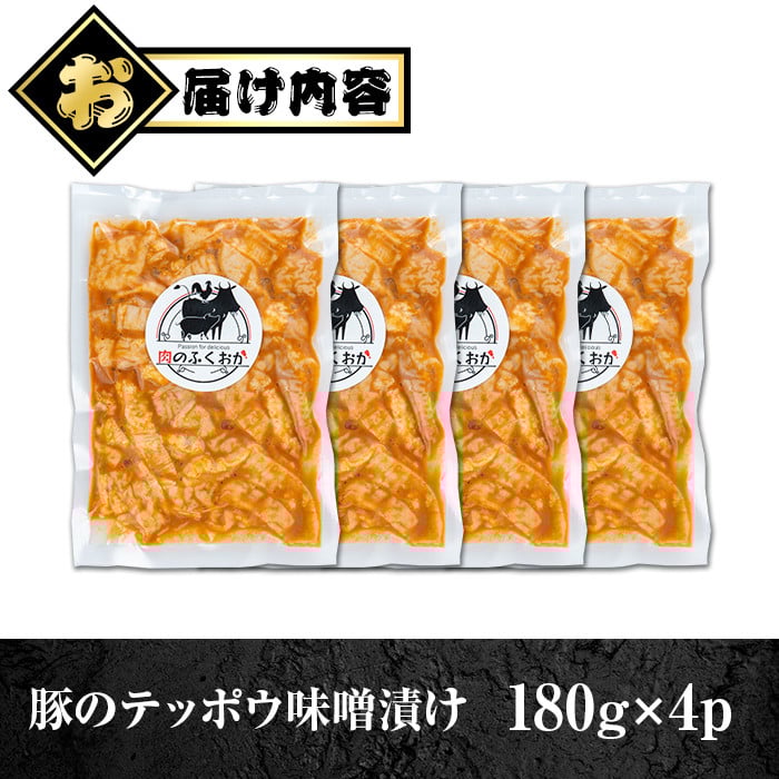 - P79008 豚肉のテッポウ 自家製味噌ダレ味付き(計720g・180g×4P) 鹿児島 国産 豚肉 豚テッポウ てっぽう ホルモン あぶら チューブ みそだれ 味噌づけ 味噌漬け おつまみ 小分け パック 冷凍 冷凍食品【肉のふくおか】