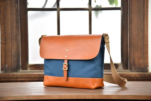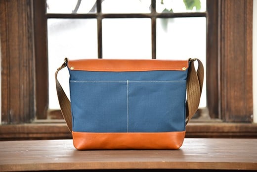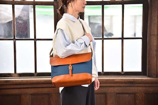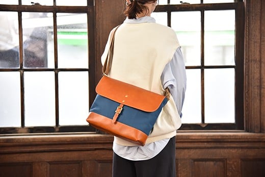 近江牛レザーと地産帆布で作ったショルダーバッグ びわ湖ブルー Lサイズ【CC41W】