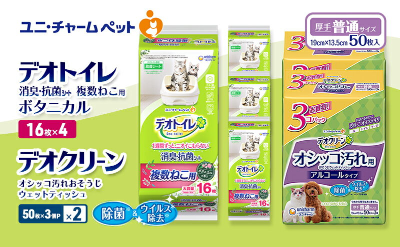 - 【ふるさと納税】デオトイレ 複数ねこ用 消臭・抗菌 シート ボタニカル 16枚×4 デオクリーン オシッコ汚れ おそうじ ウェットティッシュ (50枚×3個P)×2 ペットシーツ ペットシート トイレ 猫 ユニ・チャーム お届け:通常ご寄附頂いてから約1~2ヶ月以内に発送