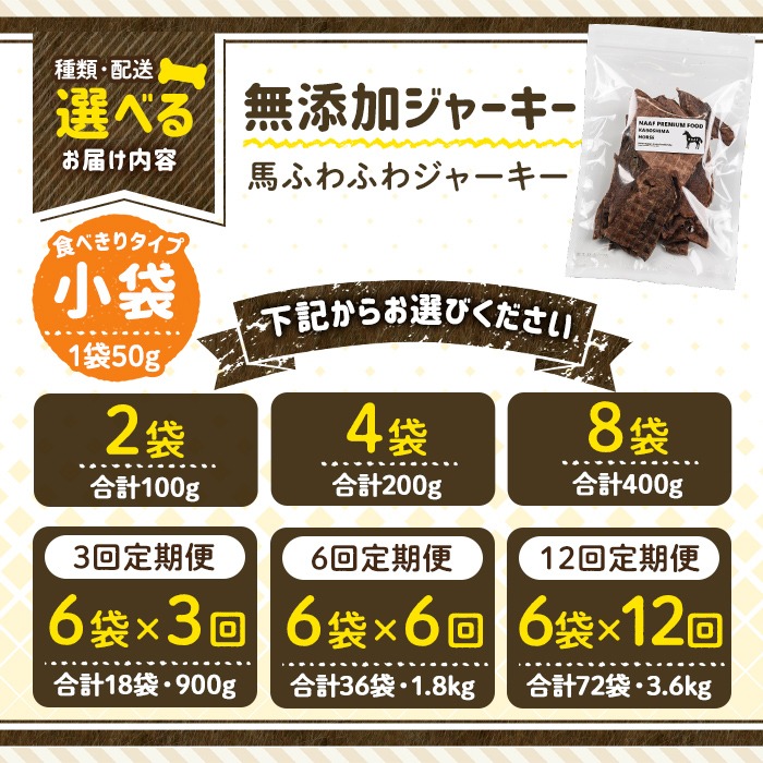 - a1053 《容量・配送が選べる》<保存料・着色料 不使用>愛犬用無添加 馬ふわふわジャーキー(2袋・4袋・8袋・3回定期便・6回定期便・12回定期便)【Nフードサービス】姶良市 馬 ジャーキー 犬 ドッグ ペット フード エサ おやつ ごはん 間食 ご褒美 ペット関係