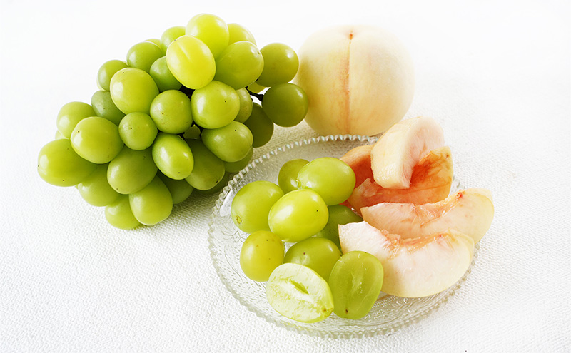 - 桃 ぶどう 2026年 先行予約 果物詰合せ 白桃 2玉 (1玉200g以上) シャイン マスカット 晴王 2房 (合計約940g) 化粧箱入り 岡山県産 国産 フルーツ 果物 ギフト