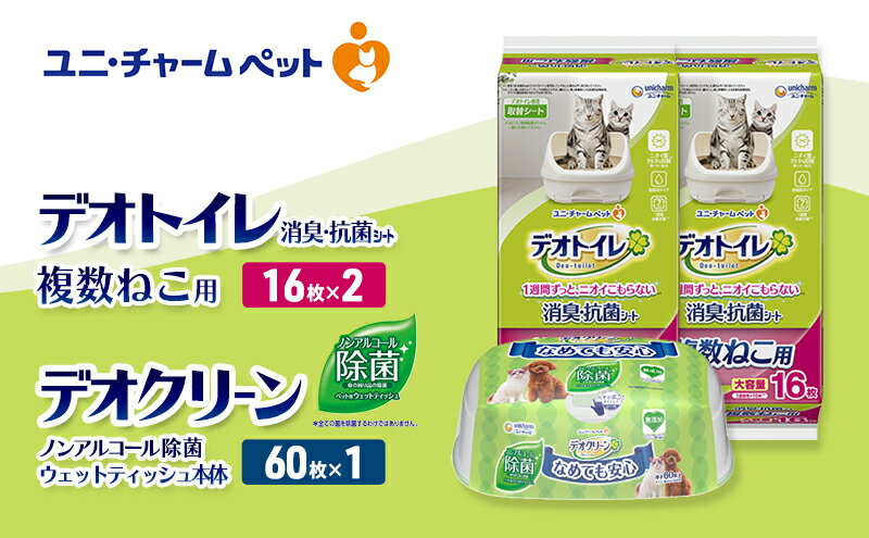 【ふるさと納税】デオトイレ 複数ねこ用 消臭・抗菌 シート 16枚×2 デオクリーン ノンアルコール 除菌 ウェットティッシュ 本体 60枚×1 ペットシーツ ペットシート トイレ 猫 猫用トイレ ペット 清潔 ユニ・チャーム お届け:通常ご寄附頂いてから約1~2ヶ月以内に発送