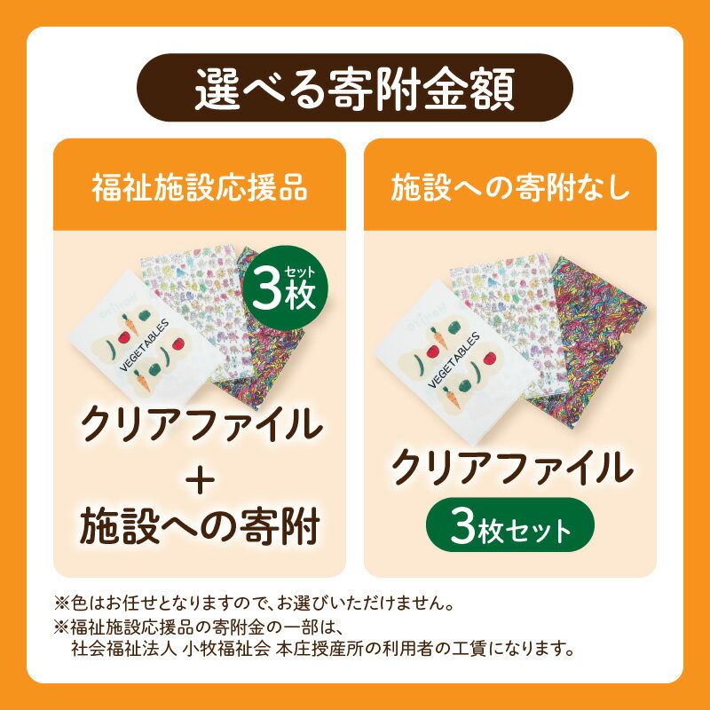 - 【ふるさと納税】障がい福祉事業所製作 福祉施設応援品 選べる 施設への寄附なし 施設への寄附あり オリジナル クリアファイル セット 3枚入り 福祉 障がい福祉 福祉事業所 支援 文房具 文具 事務用品 かわいい イラスト入り 手作り 愛知県 小牧市 送料無料