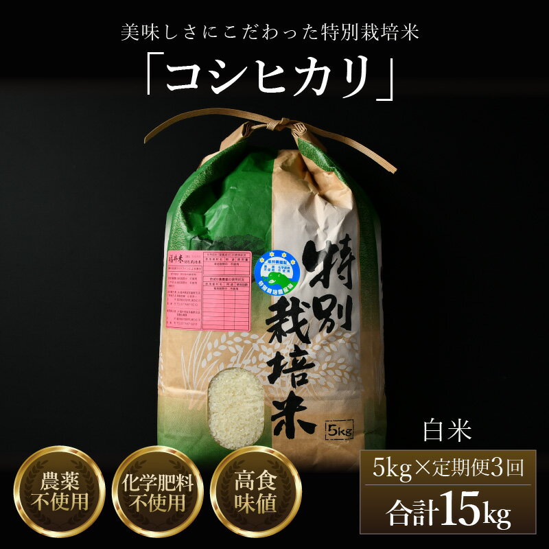 - 【ふるさと納税】【先行予約】【令和8年産 新米】定期便《3ヶ月連続お届け》コシヒカリ 精米 5kg (計15kg)特別栽培米 農薬不使用 化学肥料不使用 / 残留農薬ゼロ 高品質 鮮度抜群 福井県産 ブランド米 白米 ※2026年10月上旬以降順次発送