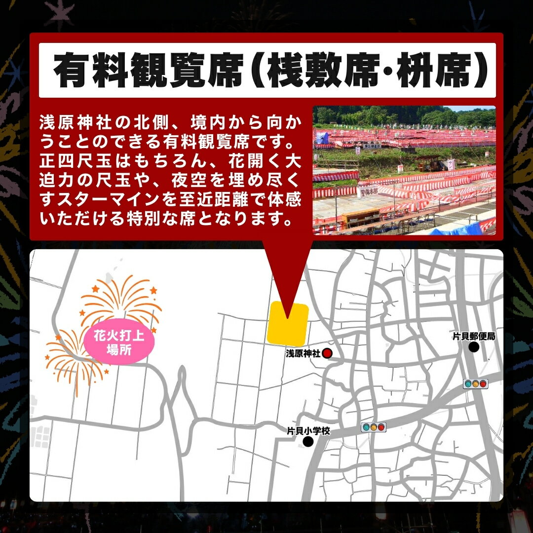 - ★【ふるさと納税】【令和8年9月12日(土)】世界一の四尺玉を体感!片貝まつり花火大会 奉納煙火40万円分+桟敷枡席チケット 新潟県小千谷市 | 片貝まつり花火大会 観覧チケット 観覧 チケット 桟敷席 片貝まつり かたがい 祭り 新潟県 小千谷市 【0003-0004SV03-01】