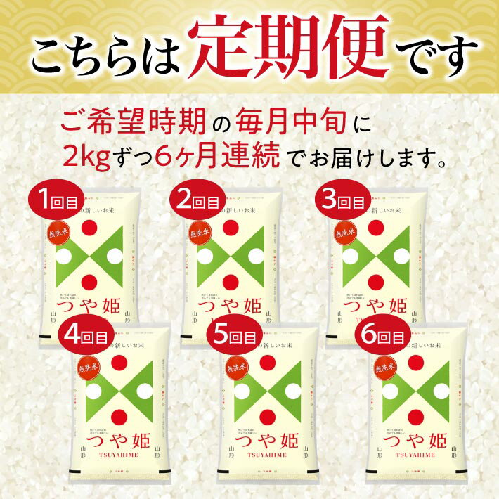 - 【ふるさと納税】≪6ヶ月定期便≫ 無洗米 つや姫 2kg×6ヶ月連続 計12kg 山形県庄内産 毎月中旬にお届け 東北 山形県 遊佐町 庄内地方 庄内平野 庄内米 精米 白米 米 お米 ブランド米 ごはん ご飯 連続定期便 6回連続 小分け