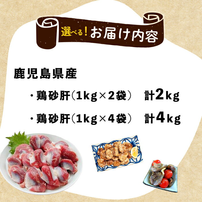 【ふるさと納税】<すぐ届く!>【容量が選べる!】鹿児島県産鶏砂肝(計2kg or 4kg) 肉 鶏肉 砂肝 砂ズリ 砂ずり 骨なし 唐揚げ から揚げ 焼鳥 炒め物 塩焼き BBQ 国産 九州産 冷凍【宮下商店】