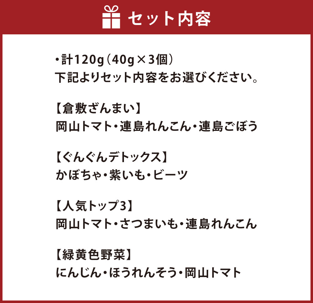 - 【ふるさと納税】犬用カリカリおやつ 【倉敷ざんまい / ぐんぐんデトックス / 人気トップ3 / 緑黄色野菜】<選べるセット内容> 3種類セット 計120g(40g×3個) 生おから 野菜 やさい わんちゃん 低カロリー 健康 ペット用品 犬用品 お菓子 国産 岡山県産 倉敷市 送料無料